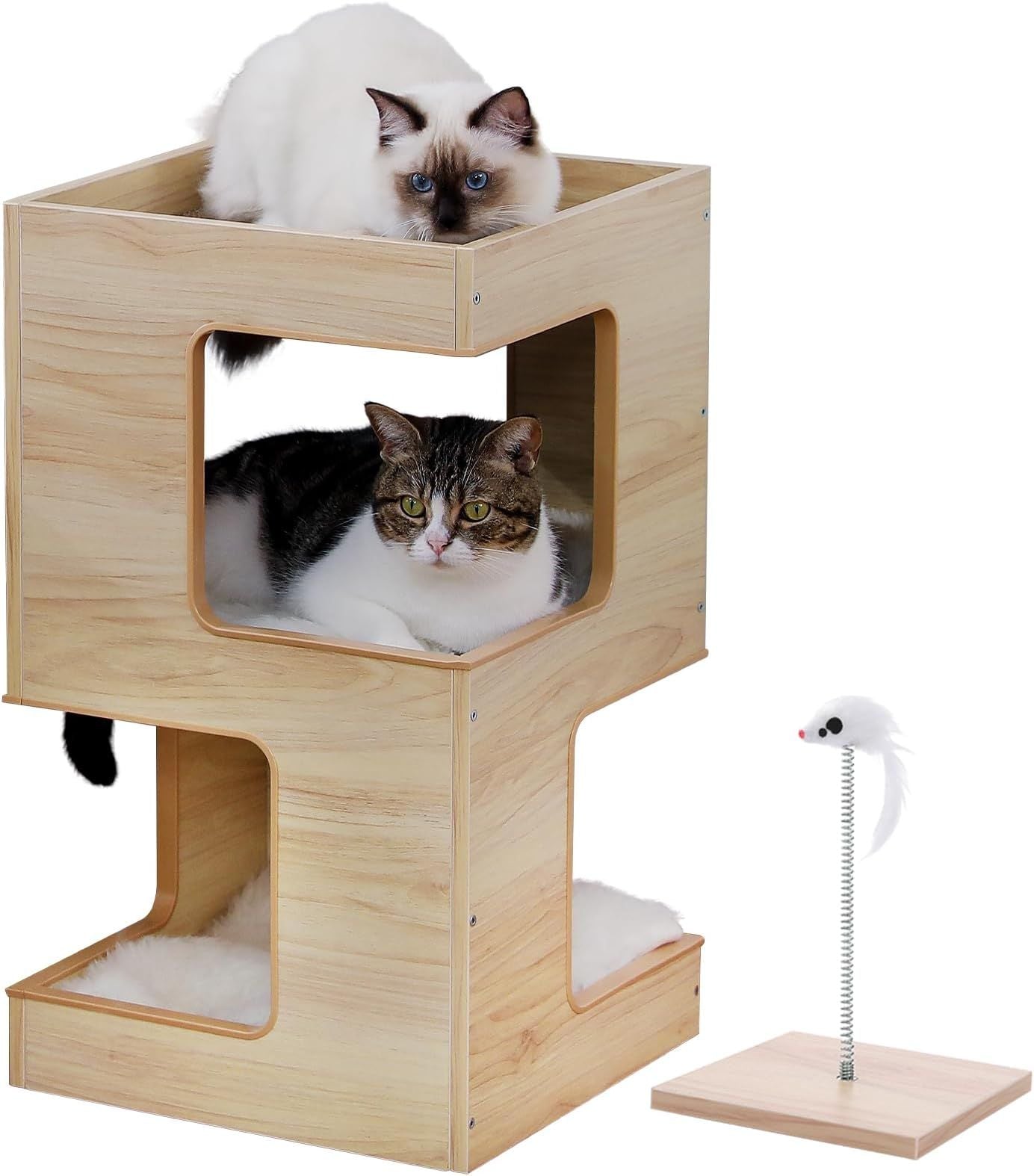 Cat Condo Small Modern Cat Tree for Indoor Cats, 23.6" Wood Cat Furniture, Cat Tower with Free Cat Toy, Scratching Pad and Removable Soft Mats for Kitten Beige