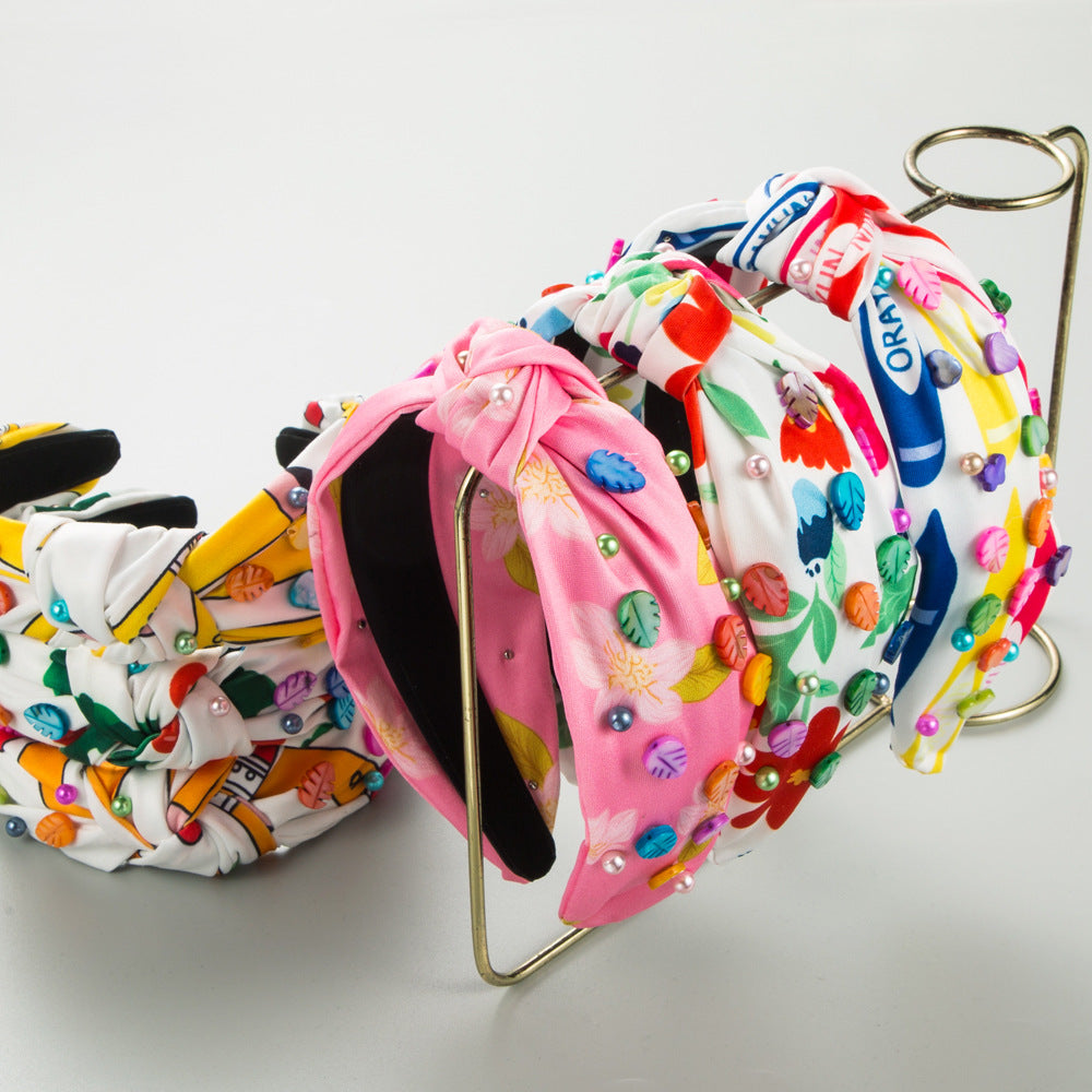 Korean Style Fashion Sweet Temperament Beaded Hairband Women High Quality Printed Fabric Leaf Accessories Headband Hair Accessories
