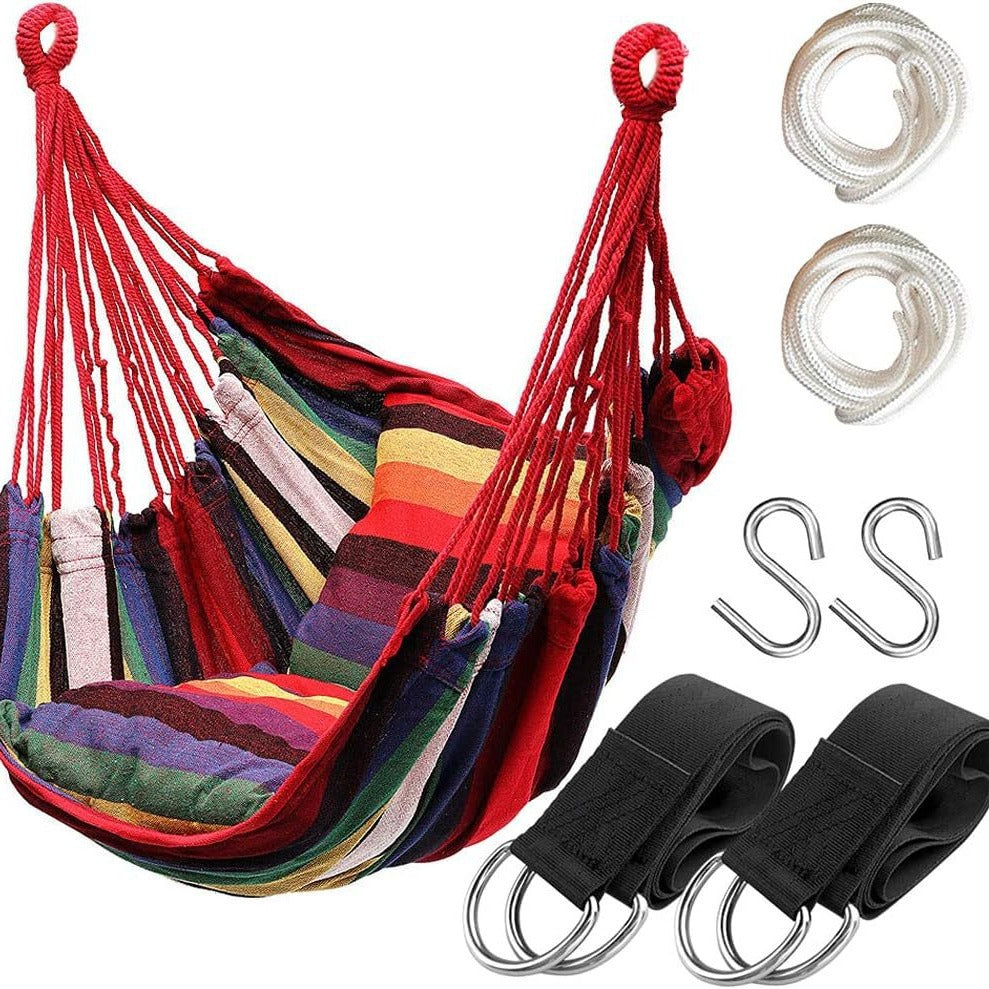 Pillow hammock chair in rainbow stripes, foldable outdoor hanging chair with anti-roll and slip-resistant design, bedroom swing chair without bars and with cushion